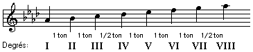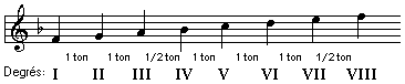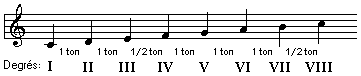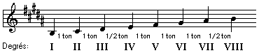 Dans le graphique ci-dessus, on peut remarquer que dans la gamme diatonique majeure, le demi-ton diatonique se trouve entre le troisième et quatrième degré et entre le septième et huitième degré.